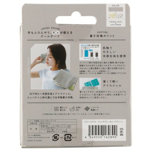 ■カラー:フレンチグレー×リーフグリーン ■サイズ:約190×100mm ■素材:冷感生地:レーヨン52%、ナイロン48% / タオル生地:綿75%、ポリエステル25% / ジェル:PVC(袋)、グリセリン、水、高吸水性ポリマー、防腐剤 ■重量:本体:約10g、ジェル:約80g ■生産国:中国 備考※メーカー取り寄せ商品となりますので、ご注文後の注文キャンセルはお承りできません。