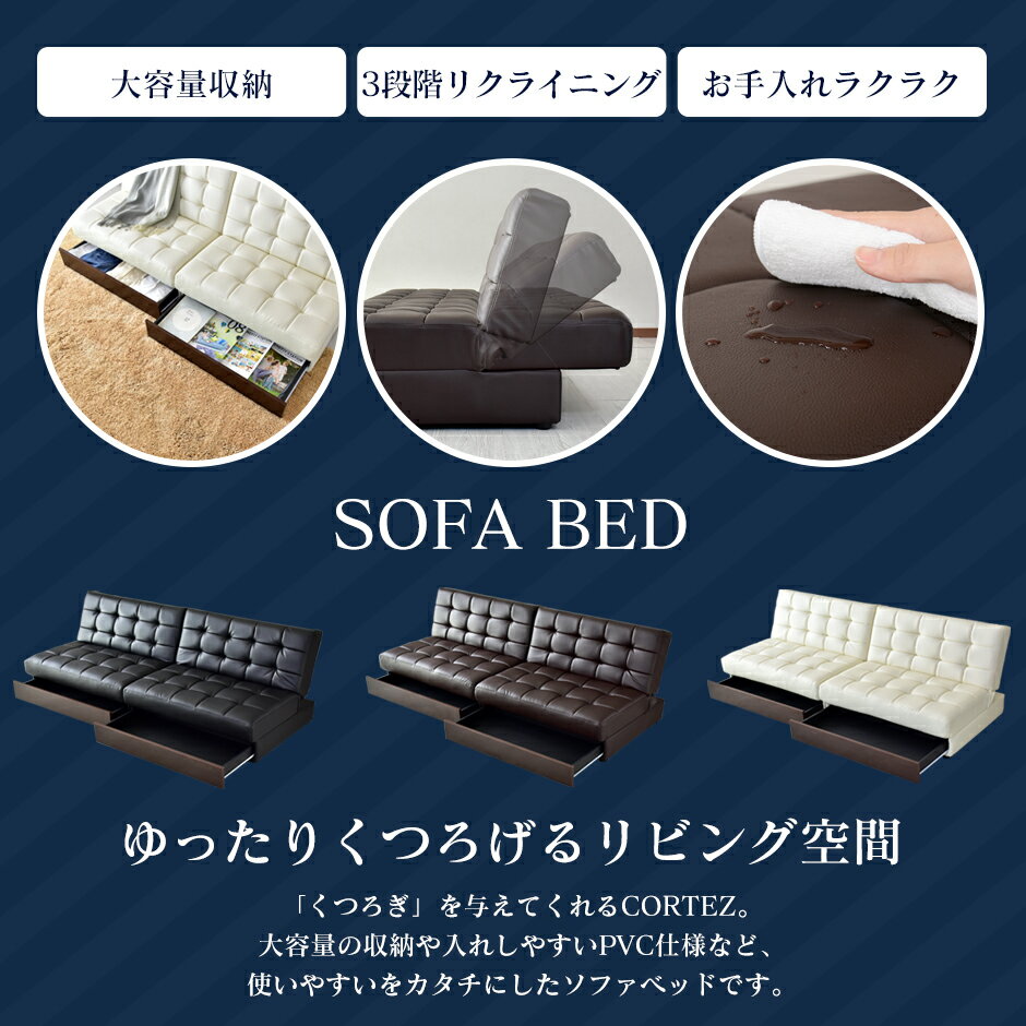 配送について 送料 無料 (北海道+17,000円・沖縄・離島・一部地域見積り) ●商品詳細 -infomation- 商品名 ソファベッド Cortez【コルテス】 サイズ 幅174×奥行90×高さ34〜70 座面高34(cm) 材 質 本体:天然木・合板・綿・ポリプロピレン・不織布・ウェービングベルト・Sバネ 張材:合成皮革 重量耐荷重 本体重量:約38kg 耐荷重:180kg(ソファ使用時)、130(ベッド使用時) 梱包サイズ 幅89×奥行92.5×高さ70(cm)/約41.5kg(梱包材含む) 備 考 ※他商品との同梱は出来かねます。