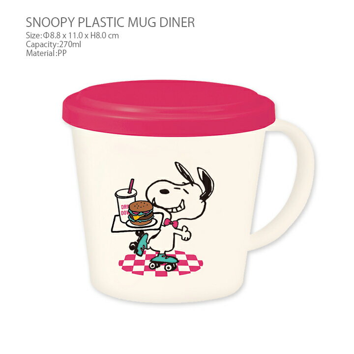 スヌーピープラマグ DINER/ランチシリーズ人気キャラクター「スヌーピー」プラスチックマグ(プラカップ)。落としても割れにくいためベビーや子供キッズも安心。歯磨き・うがい用にも使える。容量270ml(9オンス)。日本製。出産祝いやギフトにも